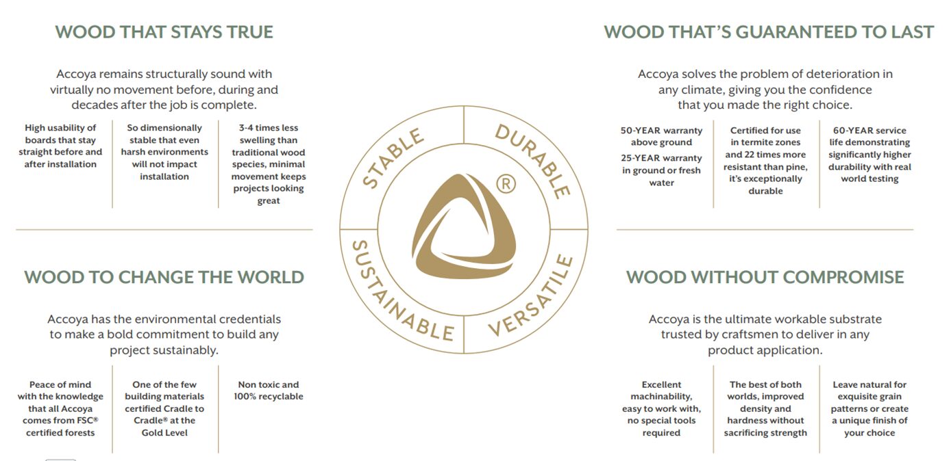 When manufacturing your product with Accoya, you can rest assured that we are Accoya approved manufacturers and create the high quality product that this wood provides. Find more about Accoya here: www.accoya.com/uk/